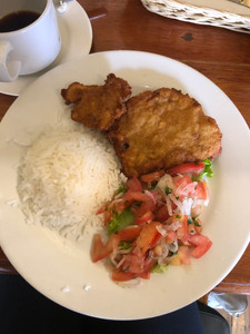 I was feeling too lazy and relaxed to try to figure out the buses after that, so I took a $4 taxi back into the city center to go and find lunch. I walked around for a little bit and finally picked a spot called Café Austria. I paid more than I normally would have for an almuerzo ($6.50 vs. $3), but I got a decent amount of food and it was very yummy. I got vegetable soup, guava juice, breaded fish, rice, a side salad and a baked tree tomato as dessert.